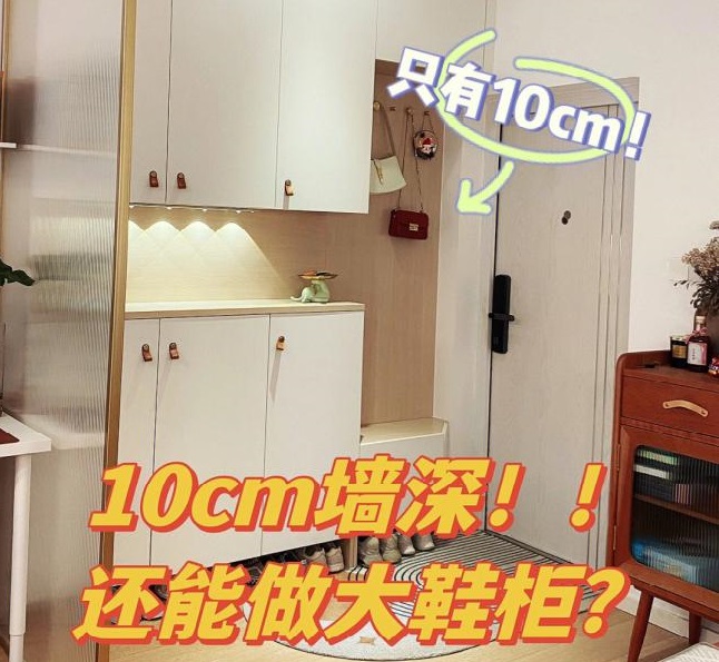 快来抄作业!10cm墙深怎么做出超大容量鞋柜?由于开发商考虑不到位,入户大门侧面的玄关墙深度只有10cm??板材十大品牌设计小能手上线啦,进门做换鞋凳+转角的设计方式,愣是给凹出了多功能大容量的玄关柜,让鞋子整齐有序,还能兼顾感应灯、挂包包、收纳、...
