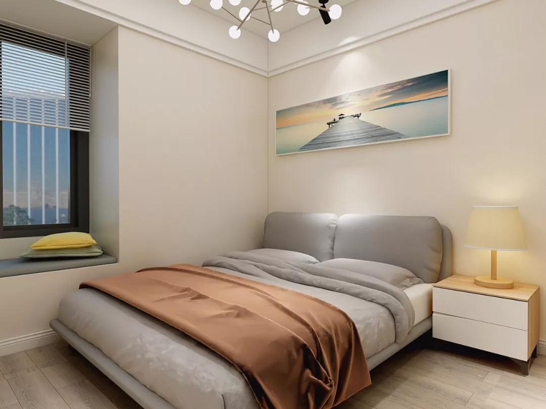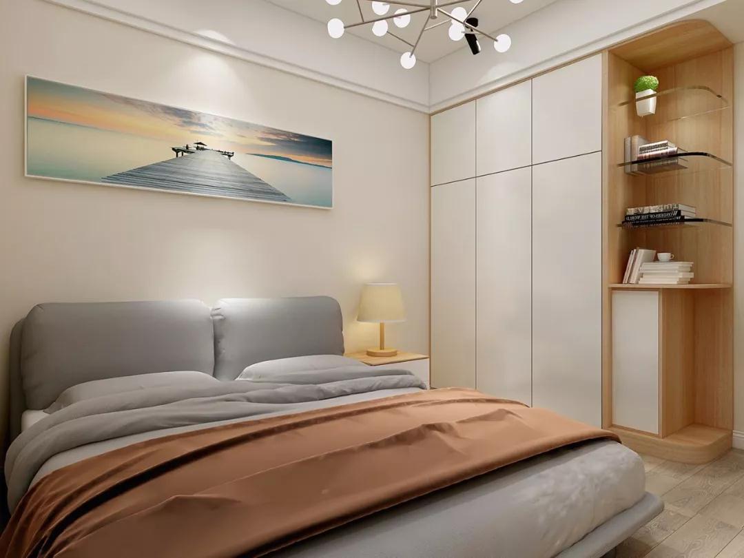 除开飘窗,次卧空间面积略显拥挤局促。通过睡眠、学习、储物、活动四个基本功能区合理设计布局,既满足日常储物收纳又不影响老人起居作息,在软装搭配上选择深色系家纺,朴实沉稳,淡泊明志,宁静致远。