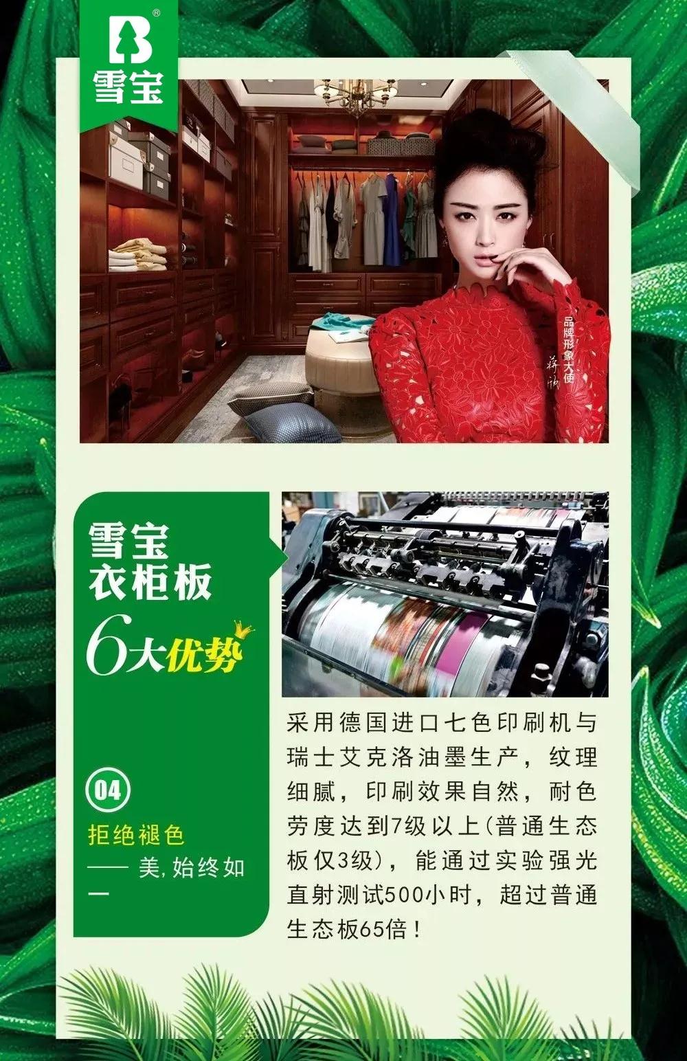 雪宝衣柜板采用德国进口七色印刷机与瑞士艾克洛油墨生产,纹理细腻,印刷效果自然,耐色劳度达到7级以上(普通生态板仅3级),能通过实验强光直射测试500小时,超过普通生态板65倍!