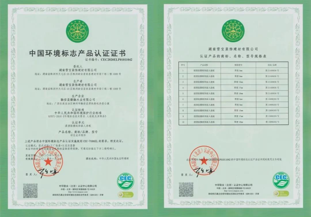 经过国家官方权威认证机构的严格审查,雪宝板材顺利通过质量管理体系认证,获得ISO9001认证(证书编号:00218Q26292R0M),充分表明在产品原料选材、生产环境、生产工艺及品质管理等多方面在行业中领先一步。