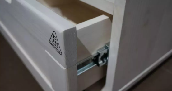 抽屉可以说是孩子们在家最喜欢的“玩具”之一。如果没有配备防拉脱装置,在过猛用力、反复地拉扯下可能拉脱,造成砸伤或夹伤的意外。这要求家长在选择儿童房柜体时,要留心抽屉这类推拉部件上导轨、铰链这些地方的设计。