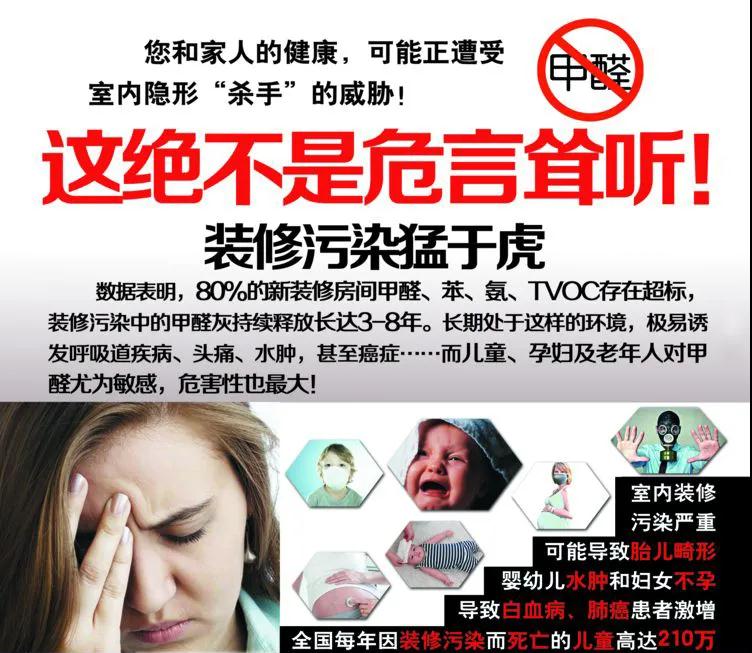 甲醛—:作为一种对人类最有害的气体,被誉为室内“夺命杀手”,严重危害新装修家庭,尤其是儿童、孕妇、老人的身体健康。