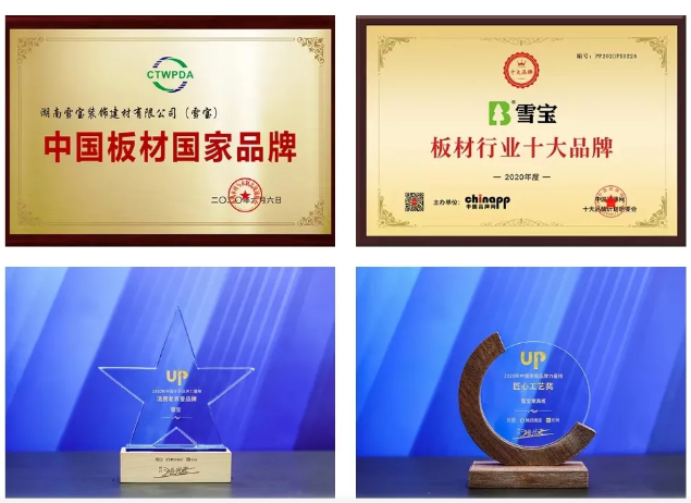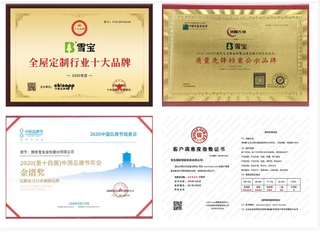 作为健康家居生活守护者,雪宝载誉而归,相继荣膺2020中国板材影响力品牌、中国质量先锋档案公示品牌、中国板材国家品牌、定制家具行业创新品牌、2020年度板材行业十大品牌、2020年度全屋定制行业十大品牌、匠心工艺奖、消费者喜爱品牌、客户满意度五星证书等荣誉称号。