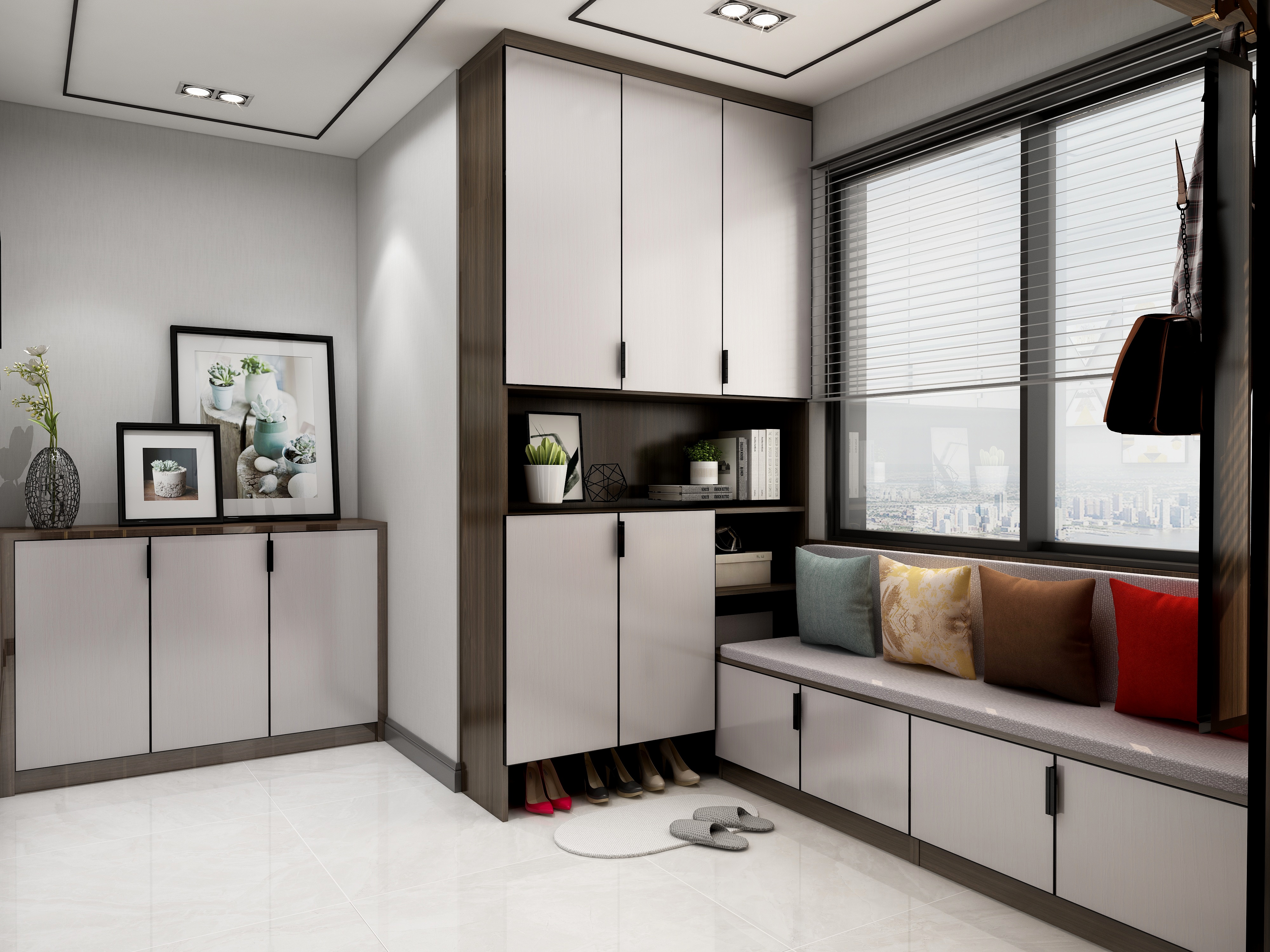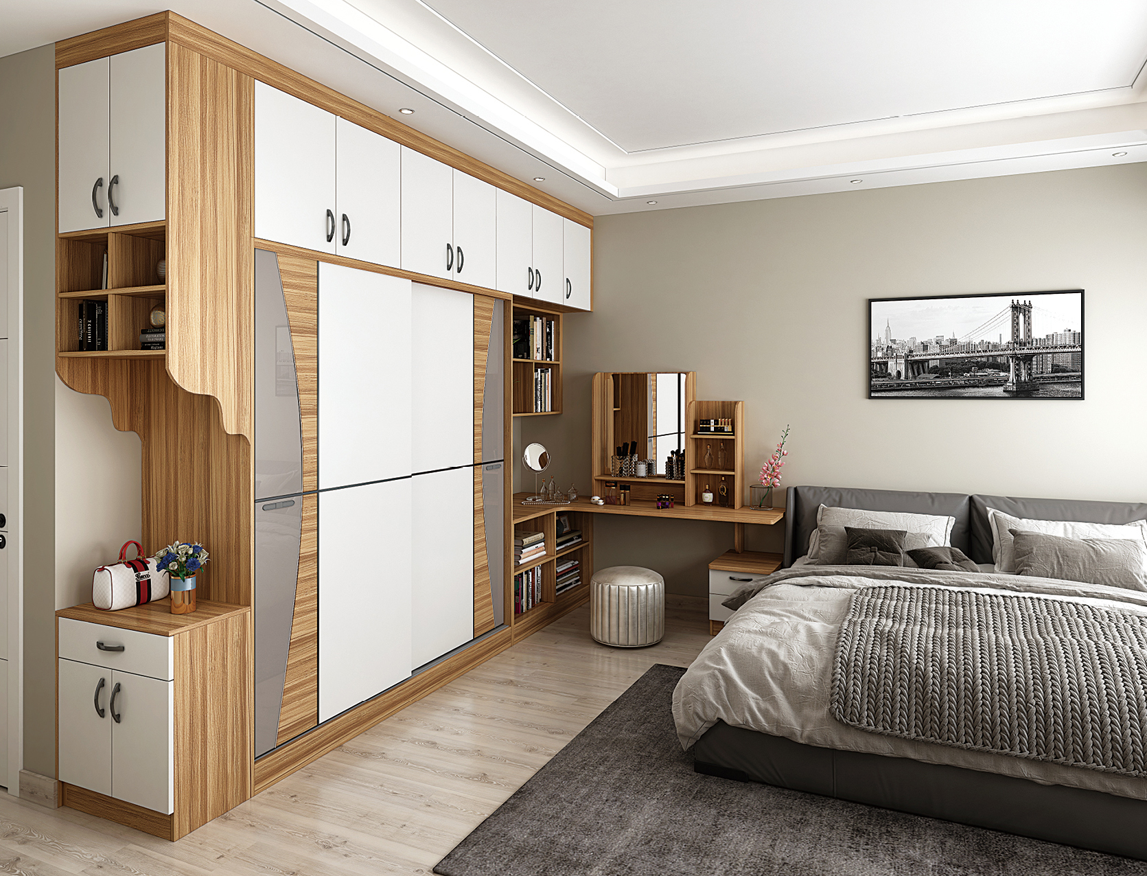 走廊家具包括:走廊柜,鞋柜,衣柜,换鞋凳或展示柜等。由于走廊的位置非常有限,不能容纳太多家具,因此定制家具只能满足这些需求,只能设计一种。橱柜不仅具有鞋柜的功能,还具有悬挂式外套和帽子收纳袋或展示架。可以设想的任何事物都可以统一设计,以使有限的空间可以满足最大的需求。