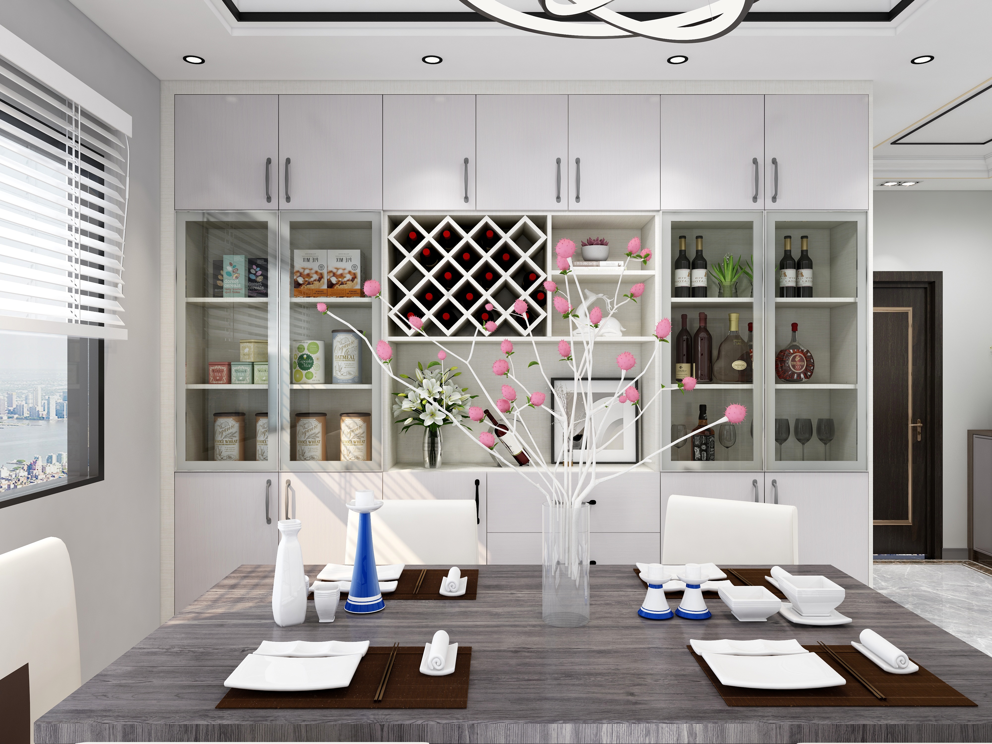 客餐厅部分包含更多内容,例如餐桌椅,侧柜,酒柜,展示柜等,客餐厅隔断柜,博古柜,电视背景墙柜和客厅电视柜,沙发,咖啡桌,这些功能区的巧妙设计,例如沙发,背景,书架等,都通过使用功能性组合空间发挥了作用。