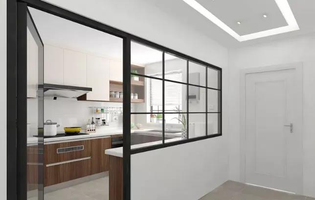 △ 增加一排储物柜,实现功能分区。把墙改为透明玻璃门窗,增大采光面积,既阻挡了油烟又不影响与餐厅的互动交流。