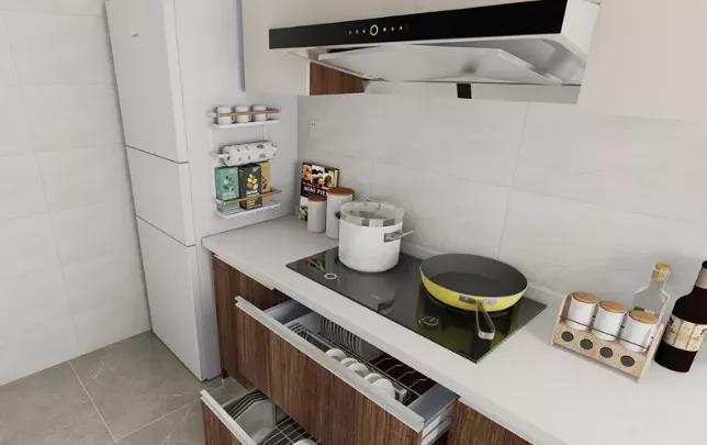 △ 内嵌式冰箱更美观,一进厨房可以很方便在冰箱里拿取食材。碗碟拉篮合理利用空间,碗碟分区收纳,拿取更轻松。