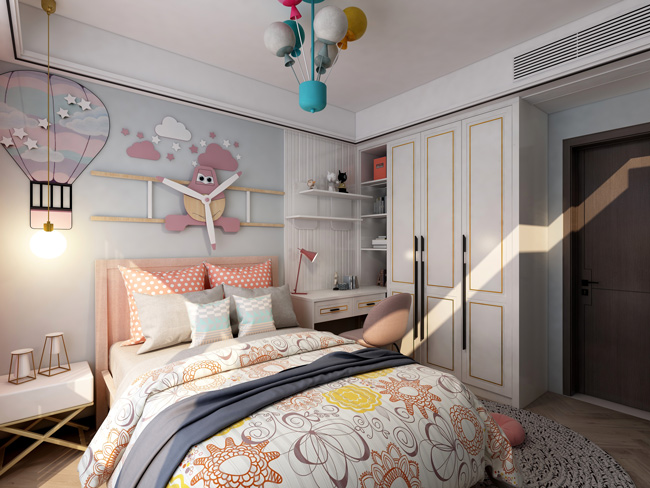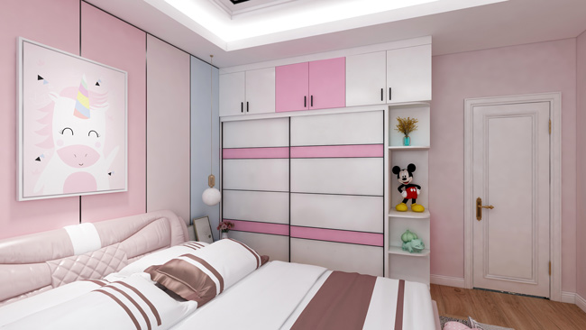 一般来说,当我们进入一个女孩的卧室时,我们首先看到的是他的房间的颜色。如果颜色搭配过于华丽,人们会感到夸张。如果使用黑色或其他深色,女孩在休息时会有一种不好的感觉。因此,我们一般使用暖色,如粉红色或蓝色,它使人们一进入卧室就感到突然明亮。此外,地板的选择一般都是以木地板为基础的,这样即使你不穿鞋踏在地上,也不会感到一丝凉意,你可以随时坐在地上进行各种游戏。