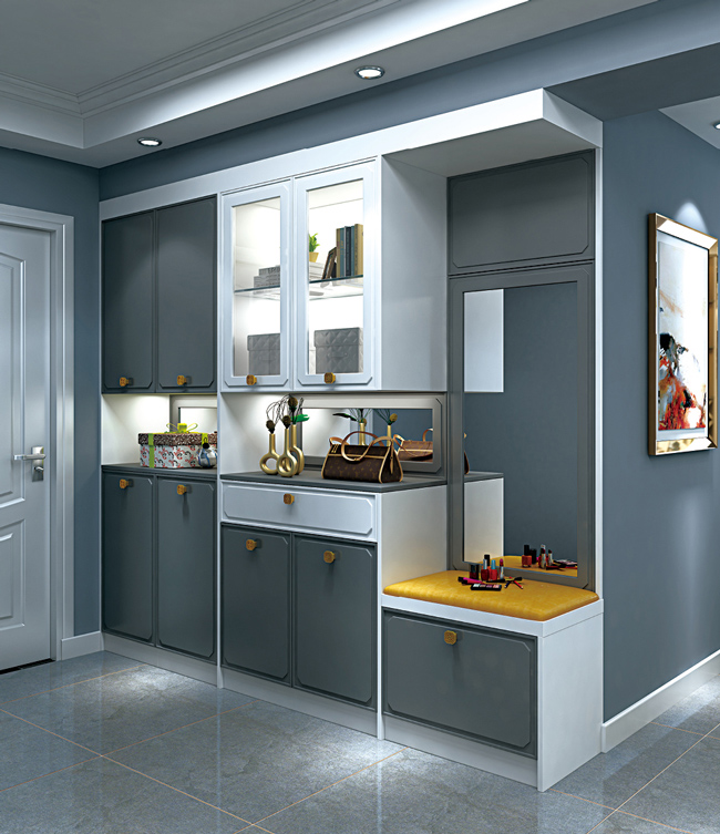 入户是进入房子的第一印象。整洁有序的入口可以给人留下更好的印象。在空间规划中,玄关处设置了一个大容量的玄关柜,以收纳全家的鞋子,在玄关柜中断设置面台,方便各种小物品的取放。换鞋凳采用可抽出式设计,不仅增加了储物空间,而且大大降低了空间利用率,进出门也更加方便。您也可以根据自己的喜好在门廊橱柜上设置一面镜子,方便您在出门前整理自己的仪容,让自己带着美好的心情出门。