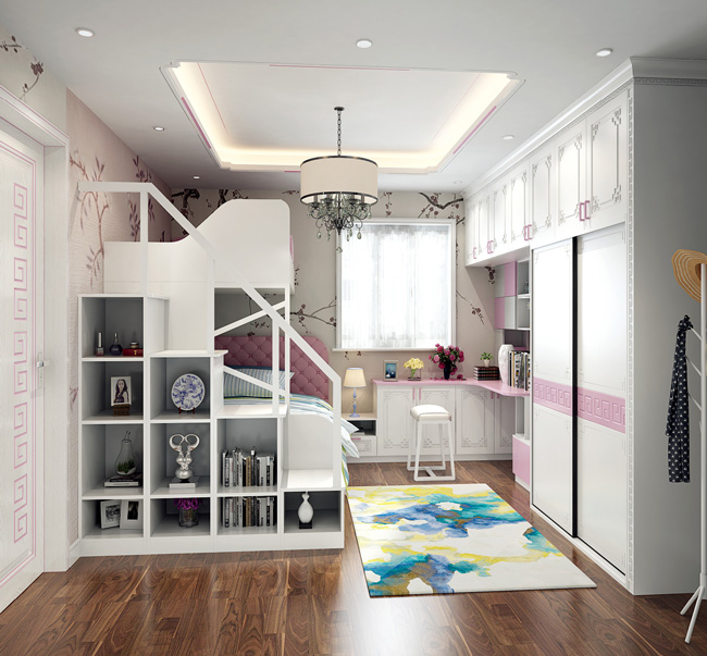 2、儿童房中的家具和收纳柜不能太多,越多越容易造成甲醛污染超标。儿童成长的速度比较快,每个成长阶段留下来的玩具等物品比较多,在这我们需要儿童房中的家具设计多功能或者组合式的设备。如市场上有很多的双层床踏脚的台阶就是设计成一个一个小箱子组成的,这样就可以合理运用了室内的空间。