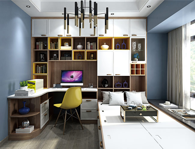 客卧采用储物床+书桌+柜子的设计形式虽然是可以实现空间的最大化利用,但是如果再想改造,就比较难了,所以在装修之前一定要慎重考虑自己的使用需求。