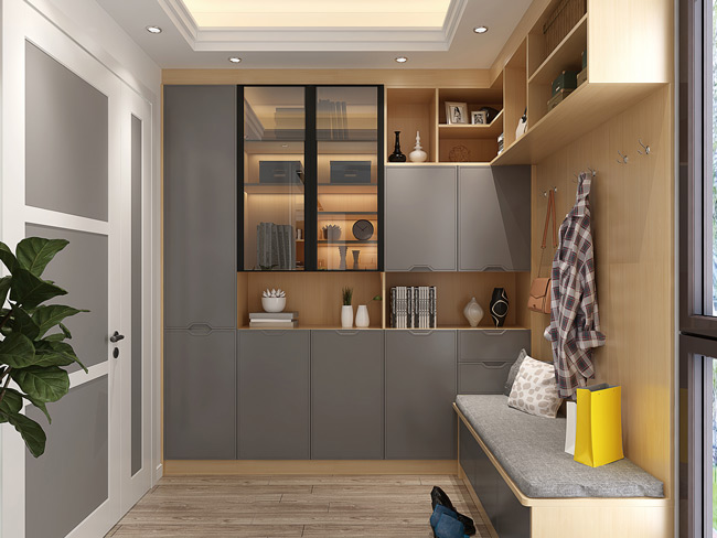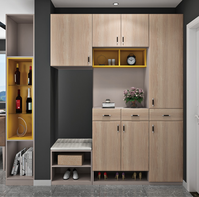 至于换鞋凳的话,如果鞋柜容量足够的话,可以留出一部分空间做成换鞋凳,换鞋凳和鞋柜一体化。