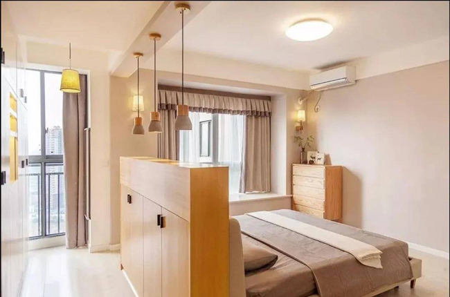 卧室的隔墙被打碎后,它与家中的小阳台一起打开,设计成一间宽敞的主卧,带有衣帽间,但如果没有隔墙,它将显得不规则且空旷。此时,你可以使用一个低柜作为床边隔板,将睡眠区和存储区分开。空间的透明度和宽敞度不会受到影响!还有一种大公寓的视觉感觉,是不是很棒?