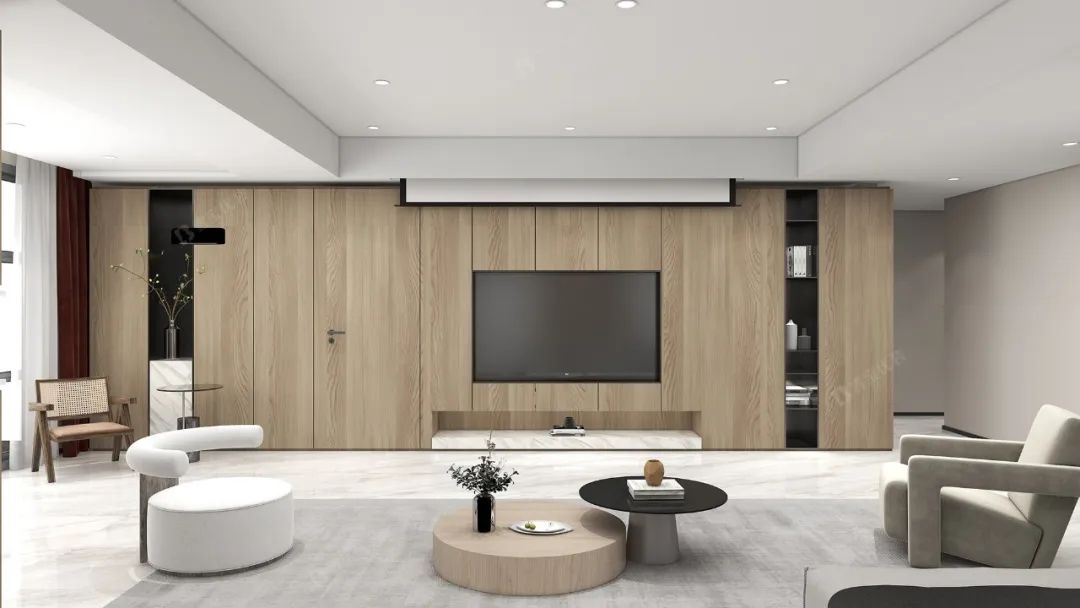 整墙电视柜,墙柜一体,外表简约时尚,自然素雅,无拉手设计让整个柜体更为利落清爽。