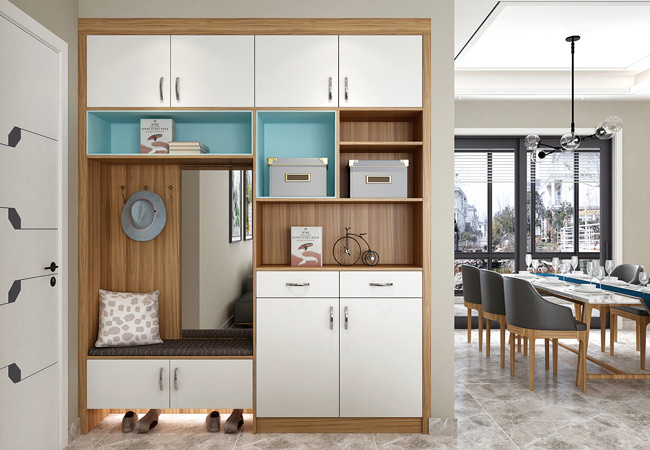 答:层板划分,实现更好的分类摆放,长靴可以放,千万别“委屈”了鞋子。左边拉过趟门形成封闭柜即可当衣柜,右边开放区可挂放包包、帽子,底部则是鞋子的安身之所,功能齐全。