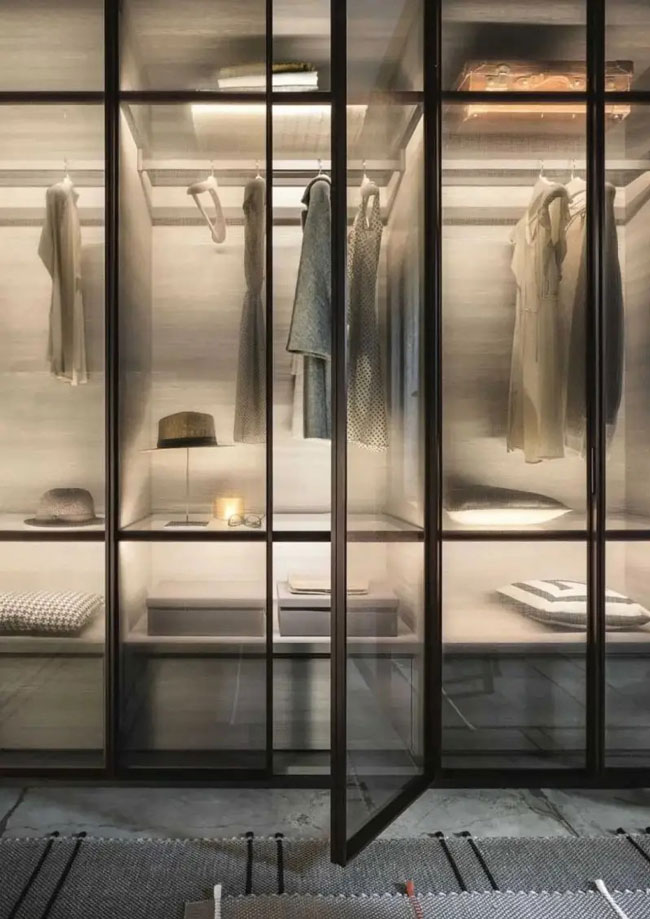 玻璃门不好清洁容易落灰,而且容易显得内部杂乱。最重要就是半夜起来万一玻璃反光岂不是很吓人。玻璃门密封效果好,如果衣柜里面和外面的温差太大,会导致水蒸气的产生,衣服容易受潮。