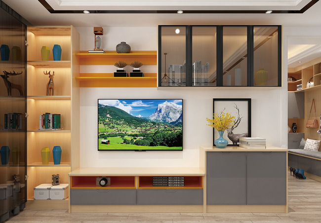 其设计手法也是不拘一格、丰富多样。或组合线条利落的隔板进行设计,让画面显得更为协调美观;或留出几个开放式展示柜,将相框、装饰品、书籍摆放其中,让客厅多了一份精致感,空间看起来也更加完整了。