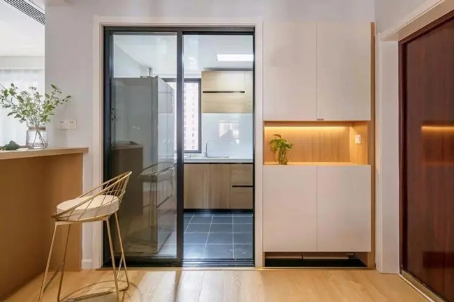 小户型的嵌入式柜体可以利用垭口、门洞,不仅避免了垭口门洞直接裸露出来的视觉突兀感,还让鸡肋空间可以更好地利用起来。把入户柜做成嵌入式,减少柜体的占地面积,在玄关这个小空间里特别实用。而且由于嵌入式设计带来的立面平整感,即便做的是整墙入户柜,在视觉上也会显得轻盈不压抑,高级又大气。