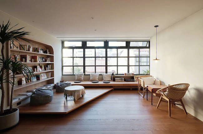 用地台抬升一块休闲区,可以经常窝在此处喝喝咖啡、聊聊天,增进家人之间的感觉。