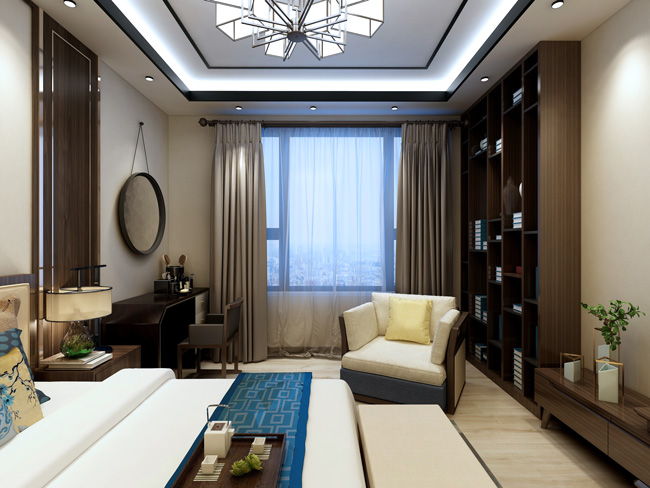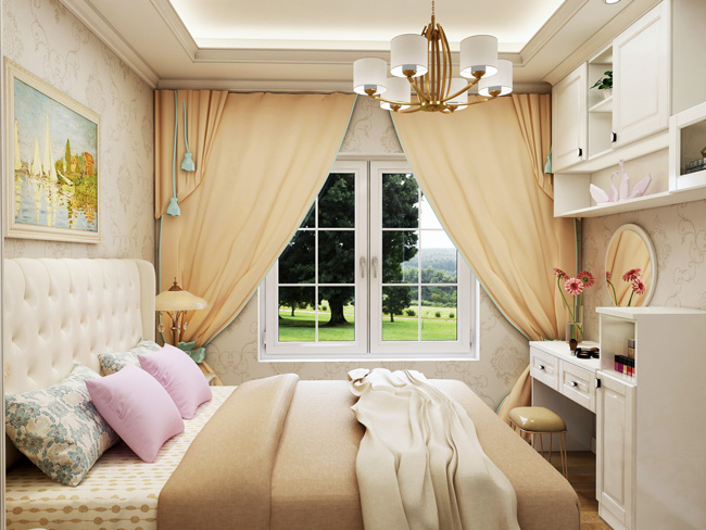在卧室设计时,要以床为中心,卧室装修风格、布局、色彩、装饰等都要以床为中心。床的位置定好后,再考虑其他设计。