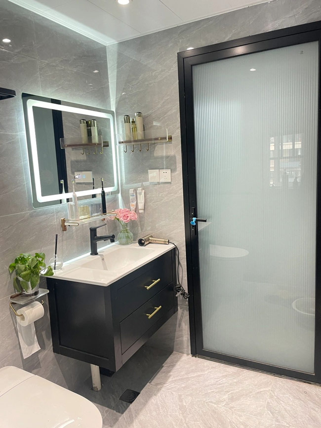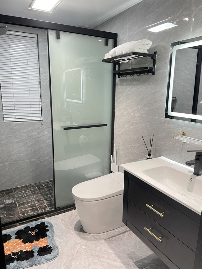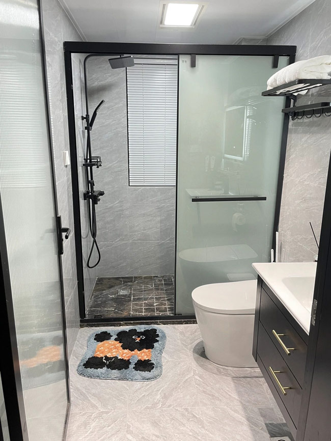 独立淋浴房常见的装饰隔断是采用玻璃门,做好钢化与防爆处理,外开门的设计更能消除安全隐患。