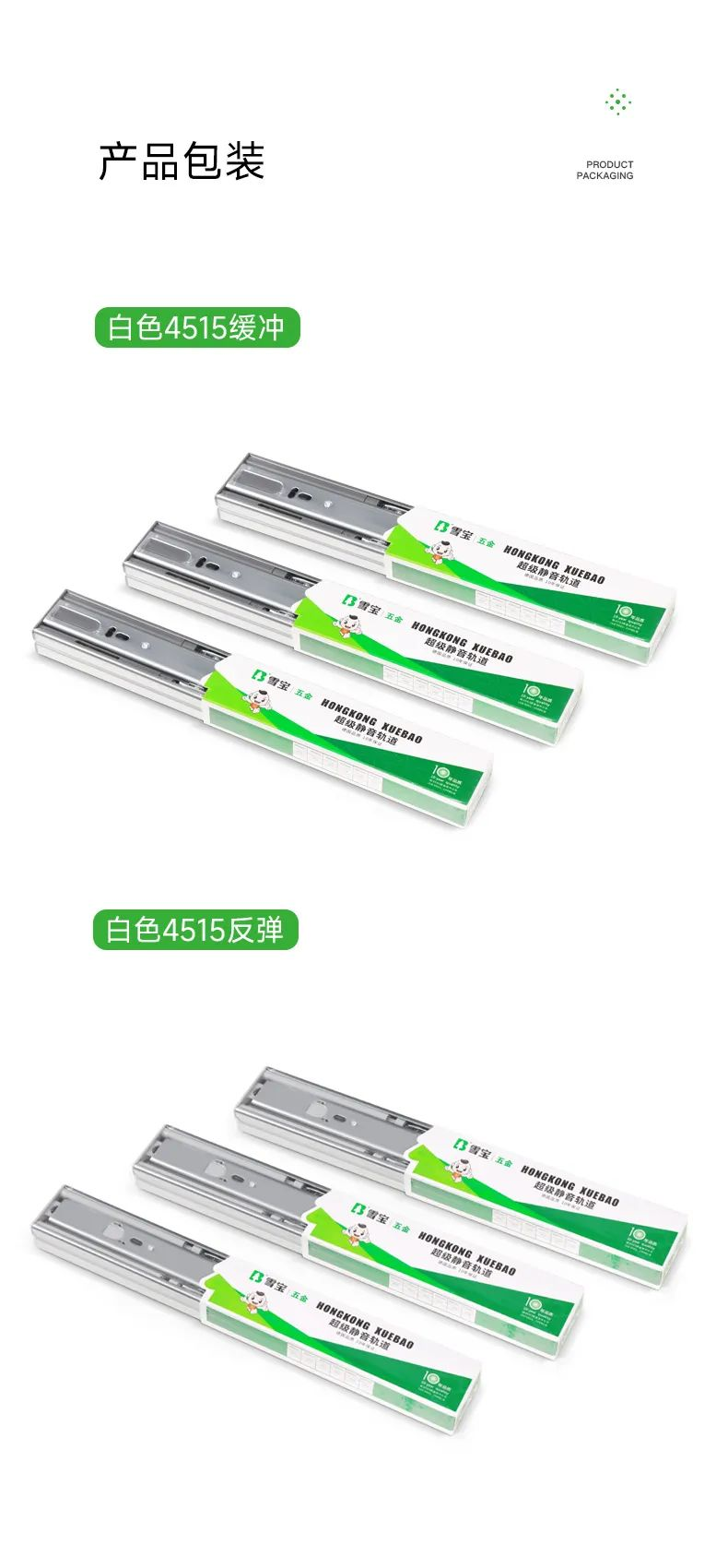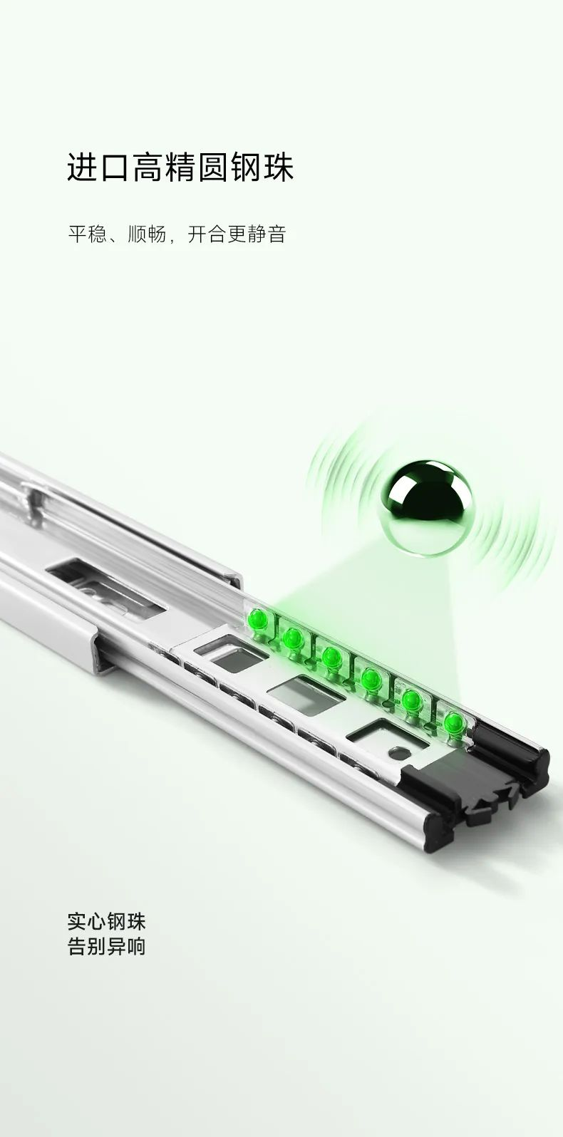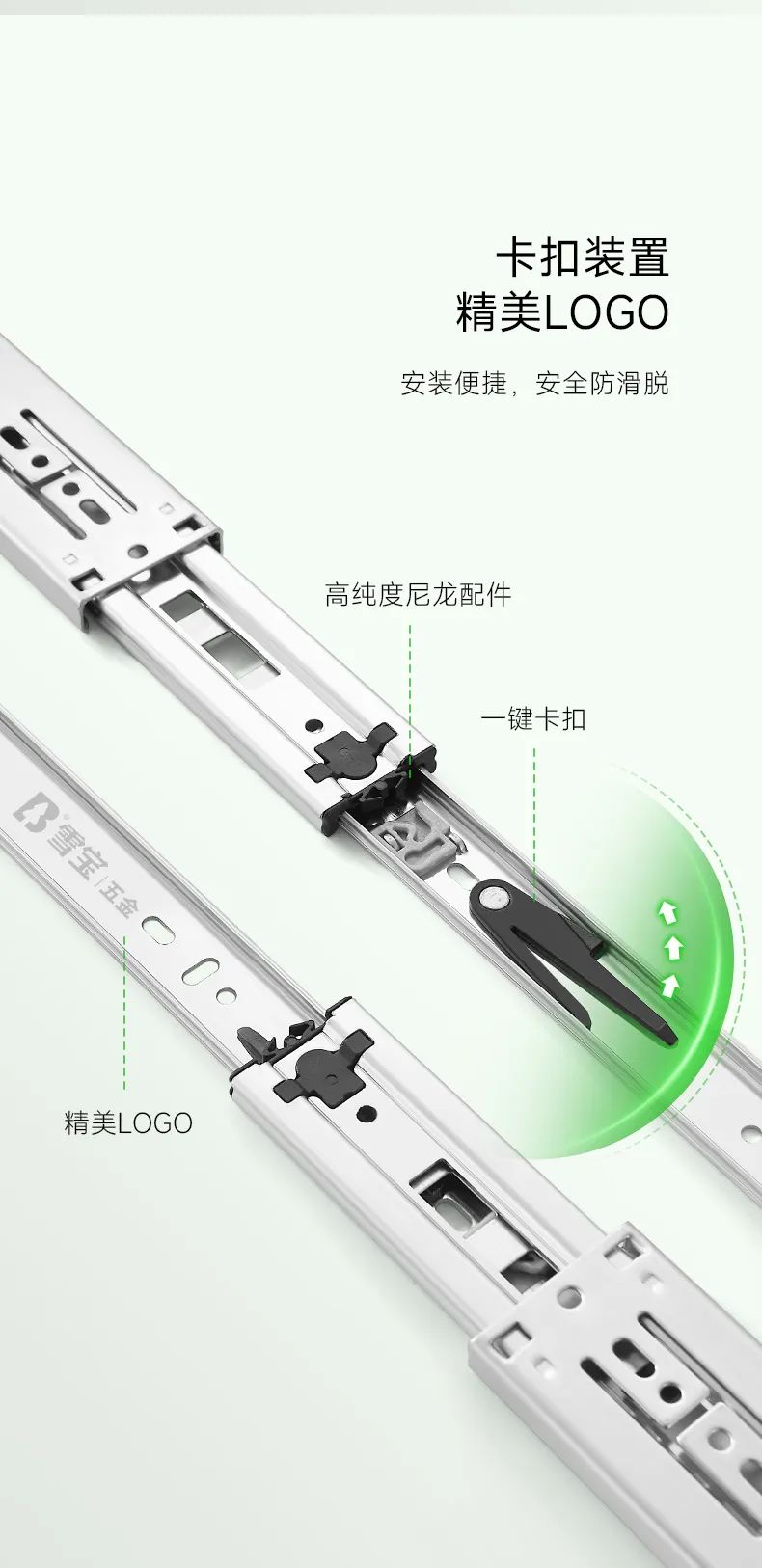 滑轨抽屉在现代家具中是必不可少的组成部分,而在整个抽屉的设计中,小小的滑轨对整个抽屉的质量可有着举足轻重的影响,那些大大小小的抽屉能否自由顺滑地推拉、承重如何,全靠滑轨的支撑。雪宝4515缓冲(反弹)三节轨→静默守护居家生活的温柔时光!