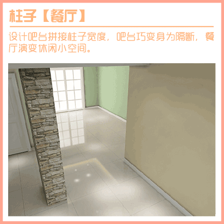 【4、柱子·餐厅】设计吧台拼接柱子宽度,吧台巧变身为隔断,餐厅演变休闲小空间。