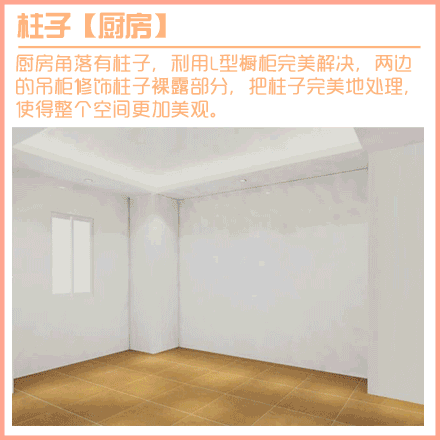 【5、柱子·厨房】厨房角落有柱子,利用L型橱柜完美解决,两边的吊柜修饰柱子裸露部分,把柱子完美地处理,使得整个空间更加美观。