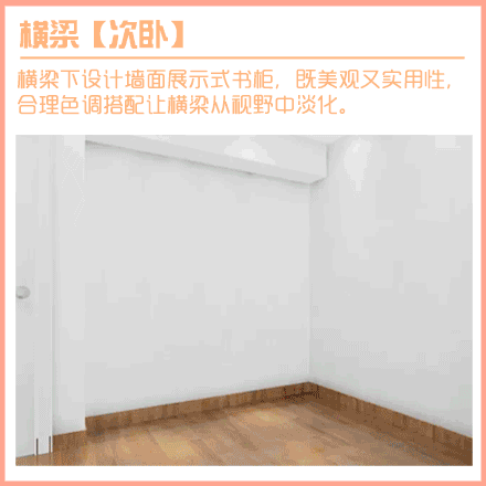 【7、柱子·次卧】横梁下设计墙面展示式书柜,既美观又实用性,合理色调搭配让横梁从视野中淡化。