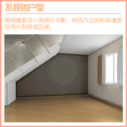 【9、不规则户型】围绕墙面设计环绕式书柜,利用凸出的转角墙面,形成小型阅读区域。