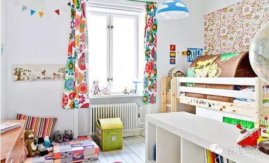 充满童趣主题的儿童卧室,有趣的弧线形床罩让睡觉也变得十分有意思,花样色彩绚丽的窗帘和墙纸遥相呼应。
