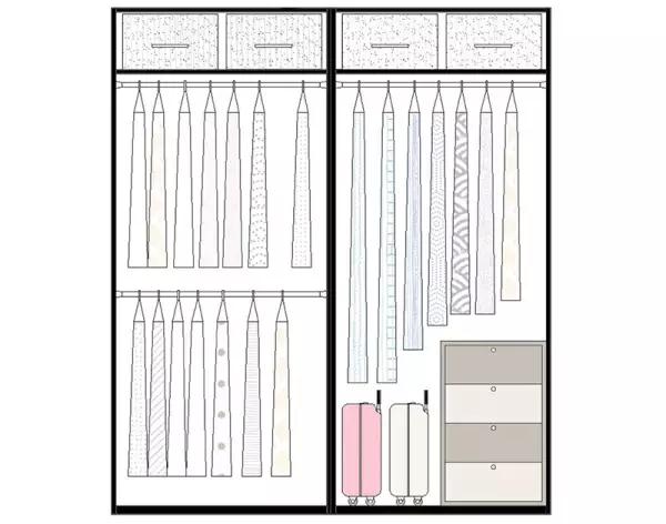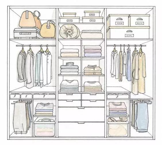 同时对目前的衣服数量与类别有清晰的了解,能够确定衣柜的大小;对衣服进行分类,并为其安排合适的收纳方式(平叠、竖叠、悬挂);根据衣服的比例分配挂杆、隔板、抽屉的位置与数量,并为后期的变动留出可以调整的空间。