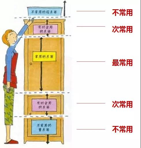 从上图可以看出,应当在哪一区域放置不同类型的衣物。最上面和最下面放置被褥或不常用、过季的衣物,触手可及的区域放置我们每天都会用到的衣物。